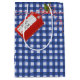 Red gift tag with pine berry and striped string bow on blue and white gingham pattern,