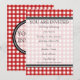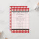 An invitation featuring a red gingham background. Sheer centre section with black trim. Personalise with your information. Opposite side features solid gingham background with text "You Are Invited" inside circle shaped frame with black trim.