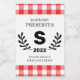 Label your homemade recipes with a touch of country! A red gingham pattern borders a space to include your monogram initial, surrounded by a black laurel. Text above and below allows for personalisation, including food type, your name and the date.