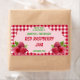 Red Gingham background with a lower right and left corner elements of a group of 3 red raspberries. Four groups of customisable text in coordinating colours of red and fresh green.