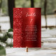 The left-hand edge of this elegant modern wedding table number card features a red faux glitter border. The word "table" and the table number appear in white handwriting script on a red faux brushed metal background. Add the names of your guests who are assigned to each table.