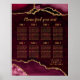 Guide your guests in style with this elegant wedding seating chart featuring a burgundy red agate marble design accented with luxurious gold details. The bold geode-inspired background creates a dramatic and sophisticated look, perfect for fall and winter weddings, formal celebrations, or glamorous evening events. Designed for up to eight tables, the layout keeps names organized and easy to read while complementing the organic agate texture. Ideal for couples seeking a stylish and unique wedding display, this seating chart blends natural stone aesthetics with a refined, modern layout. Easily personalize all text to match your wedding details and create a beautiful focal point for your reception.