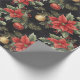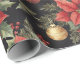 This Christmas wrapping paper features a rich, dark base adorned with vibrant red poinsettias, glossy holly leaves, and clusters of bright berries, creating a lush and festive botanical tapestry. Scattered among the foliage are classic holiday ornaments in metallic hues, adding sparkle and dimension to the design. The overall effect is elegant and traditional, evoking the warmth and cheer of a vintage Christmas celebration.