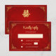 This traditional Chinese wedding RSVP card features a gold Chinese frame and a gold double happiness symbol on a shimmering red background. Matching invitation available.