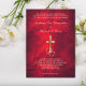 Here's a beautiful traditional Christian wedding invitation that combines a bright red gradient abstract background with glowing gold. At the center is a simple gold cross with two gold hearts at the foot of it. Your custom text is above and below the cross and heart images in light gold. The back of the invitation has the same red abstract background with a small image of the gold cross and a text field at the bottom. Currently it says "...the greatest is love", but you may easily change it to anything you'd like. Popular text is "love never fails" or "from this day forward", or "two shall become one", or even the bride and groom first names. It's up to you! A touch of traditional with a bit of modern!
