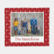 Red and gold Christmas tree pattern family banket personalised with a photo and a name.