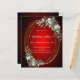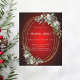 A red gradient background. An oval faux gold frame decorated with cones, white berres and pine greenery. Personalise and add the details. White text.