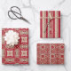 This fun wrapping paper set features three different farmhouse chic patterns of red, gold, and cream. One looks a bit like a quilt pattern with four-pointed star-like shapes, a pattern with repeated floral mandalas, and then a third pattrn of mixed stripes. The stripes are regular printing on paper but they almost seem like fabric, with a mix of gingham, dotted Swiss, gold chains, and florals. This set coordinate with other country farmhouse red, tan, and cream patterns, cards, and tags, and looks great with a variety of accents, such as bows, ribbons, natural elements like pinecones or leaves, and string. #farmhouse #stripes #striped #country #red #cream