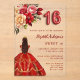 A modern, stylish and glamourous invitation for a Sweet 16, 16th birthday party. A clear, transparent background, a girl wearing a red and gold dress and red, pink and golden roses, florals. The name is written with a modern hand lettered style script. Personalise and add your party details.
