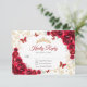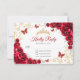 Red gold floral Quinceanera RSVP reply card. Features, script font, gold butterflies, watercolor roses and tiara. Perfect for an elegant princess style glam celebration. Personalize with your own details.