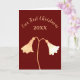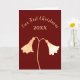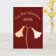 This romantic first Christmas holiday card features a red and gold flower design with calligraphy script and a personalised message inside. The flower is a twin flower, which always grows with two blossoms on one stem, inseparable. Add your information on the panel to the right and visit our store for matching gifts and ornaments.