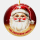 Celebrate the festive season with our red gold glitter Retro Santa Claus Christmas Ceramic Ornament! This charming ornament features a nostalgic Santa Claus design set against a stylish solid red gold glitter background, combining vintage charm with modern flair. Perfect for adding a festive touch to your Christmas Tree. Personalise this custom design with your own family name.