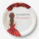 Complete your party decor with these elegant custom paper plates, designed specifically for a grand Quinceañera or Sweet 15 celebration. The design features a stunning illustration of a girl in a vibrant red ball gown, complemented by a crown of red roses and a dusting of gold glitter confetti.