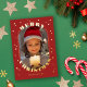 Red starry sky Christmas card with your family photo in an oblong frame with Merry Christmas in curved text framing your photo and lots of little gold stars. Gold foil and red Merry Christmas photo card with which you can wish your friends and relatives and neighbours a Merry Christmas this holiday season.