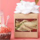 Victorian in style, this elegant vintage design features a beautiful blonde angel with a gold halo, surrounded by golden stars on a Christmas red background.