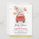 Festive baby shower invitation featuring cute artic animals, a vibrant red & gold car, balloons and sparkly stars