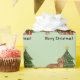 Destei's original cartoon illustration of a cute red coat colour Golden Retriever breed dog. The dog is standing by a festive Christmas tree decorated with red and yellow ornaments, a white pearl garland and a yellow star that is placed on the top of the tree. There are also two wrapped presents by the tree and there is a personalizable text area that now reads: "Merry Christmas!". The background colour is light green.