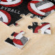 This volleyball pattern jigsaw puzzle for girls features a larger red, gray and white artsy, stylized volleyball, upon which her name and jersey number can be personalized, overlying a pattern of smaller red, gray and white volleyballs on a black background and "I love volleyball" varsity-letter-style text in gray stretching between the angled rows of volleyballs - by katz_d_zynes