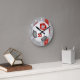 This sporty team colors soccer themed clock for a girl or a boy features a simple soccer ball graphic upon which you can customize the athlete's name, monogram and jersey number - the soccer ball's black panels have been recolored red and gray - the background is customizable light gray with overlying goal net accent graphic, vertical red varsity stripes and white clock face numerals - by katz_d_zynes
