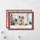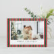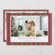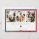 Wish friends family Happy Holidays with a red & green striped Christmas photo Christmas card in a landscape layout showcasing your family on the front over a watercolor red and green Christmas stripe pattern, and a back side with 3 family pictures and an editable note and a cute little Christmas teddy bear.