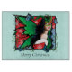 A black haired fairy wearing all red with green fairy wings. Snowflakes, red poinsettia and blue butterflies all around the fairy.