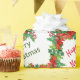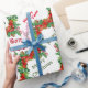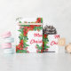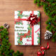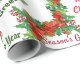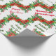 A watercolor zigzag design of red poinsettias and Christmas berries, along with seasonal greenery, forms the basis for this greetings design that wishes "Merry Christmas", "Happy New Year" and "Seasons Greetings" in the squares formed by the corner framed floral arrangement. The various greetings are in both script and block lettering and the red and green colours of the season.