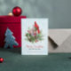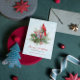 Red Green Classic Floral Cardinal Bird Merry Christmas Greeting Card. Ice blue abs white background.