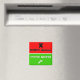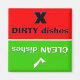A large "X" on a red background with the black text, "DIRTY dishes" means STOP! The green side means, GO! with the white text, "CLEAN dishes" and a large white check mark. Now all you have to do is remember to rotate your magnet to the correct side on your dishwasher.