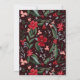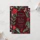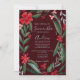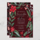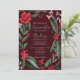 A modern layout with an original green, red and blue floral pattern and wreath illustration with leaves, flourish, flowers and berries and a modern brushed font script typography on dark red, perfect for winter and christmas weddings.
