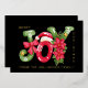 A cheerful Christmas greeting card featuring illustrated letters JOY in red and green on black background. The back of the card has space for your favourite family photo. Personalise the gold foil greeting card and spread the joy to your friends and family.