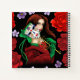 An auburn haired woman holding a Venetian masquerade mask wearing red and green in a backdrop of black with red and purple flowers