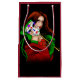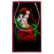 Auburn haired woman holding a Venetian masquerade wearing red and green in a backdrop of black