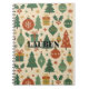 Fun and festive red and green holiday notebook inspired by mid-century modern design. Features atomic starbursts, geometric shapes, retro ornaments, pine trees, and candy elements—perfect for winter journalling, gift giving, or planning in vintage style.