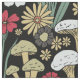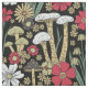 This fabric features red, green, and tan mushrooms and flowers on a black background.