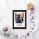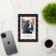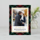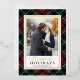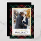 Festive plaid holiday photo card features your favourite image on a rich red and green tartan plaid background bordered with shining gold foil. "Happiest Holidays" appears beneath in gold foil script and black serif lettering, with your family name(s) and the year in classic black type.