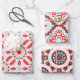 Set of three wrapping paper sheets with different patterns in matching colours. Each sheet features a seamless geometric pattern in ethnic style in red, light grey, black and white.