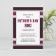 This bold, masculine design features red and grey stripes on a deep reddish brown background. The customisable text for the type of Father's Day event (BBQ, cookout, brunch, dinner, party, etc.) and location, RSVP and contact details appear inside a gold edged white area in the centre in popular, masculine red and black typography on the front of the card. The back of the card features the same bold blue and beige stripes.