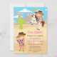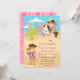 This cute and fun invitation features a cowgirl with red hair and fair skin. In one pose she is riding a horse and throwing a lasso and in the other she has a coil of rope and is waving. In the background is a western scene with sand, mountains and a cactus. The text combines decorative and sans serif fonts for a stylish and modern look. This is perfect for a cowgirl or western themed birthday party.