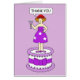 A cartoon lady stands on a giant cake , wearing a red hat and a mauve dress. The lady is holding a cocktail in one hand and saying 'Thank you'.