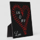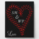 Large red heart formed from musical notes in the centre against a black background. Couple's monogrammed initials are written inside of romantic heart in silver grey text. Love is written below heart in pretty script. Nice gift idea for your sweetheart. Original Artwork Design by TamiraZDesigns.