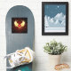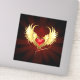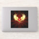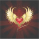 Bright red heart of an angel with golden wings shining in the dark radiant red background decorated with a pattern.
