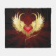 Bright red heart of an angel with golden wings shining in the dark radiant red background decorated with a pattern.