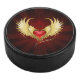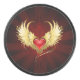 Bright red heart of an angel with golden wings shining in the dark radiant red background decorated with a pattern.