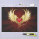 Bright red heart of an angel with golden wings shining in the dark radiant red background decorated with a pattern.