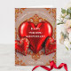 Celebrate love and commitment with this elegant and customisable wedding anniversary greeting card. The front of the card features a stunning design with three vibrant red hearts adorned with intricate golden patterns, set against a sophisticated beige background with ornate golden flourishes.