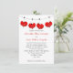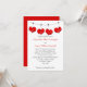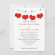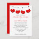 This fun and cute black and white wedding invitation has four red hearts strung across the top of the invitation like bunting, with the letters LOVE on them. The matching reply card is shown below.
