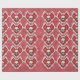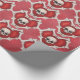 This wrapping paper has an abstract patterns in reds of star bursts with red hearts that are outlined with white bones with skulls in the centre of the hearts.