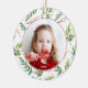 Simple and personalised, this Red Holly Pattern Christmas Photo Holiday Ceramic Ornament is the perfect gift for any family member. The white text "2018" can be changed to any year and on the back along with the photo template. Features a holly berry with green foliage and branches pattern on both sides, a photo template to customise with your own photo surrounded by a red border. Great for baby's first Christmas, keeping track of every holiday year passing for parents or grandma and grandpa.
