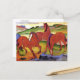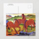 A fine art postcard with Red Horses (1911) by Franz Marc (1880-1916). Marc was a German artist from the expressionist movement, he founded the group of artists called, the Blue Rider (Der Blaue Reiter). His work is chraacterised by bright primary colours and cubist animals. This painting portrays three red horses on a green hilly landscape.