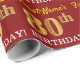 This wrapping paper design features a message like "First-Name’s 80th BIRTHDAY!", with the "80th" having a faux/imitation gold-like colour appearance. The name can be customised, and the background is coloured red. It could perhaps be used when wrapping gifts being given for somebody’s eightieth birthday. [~Z0000178]